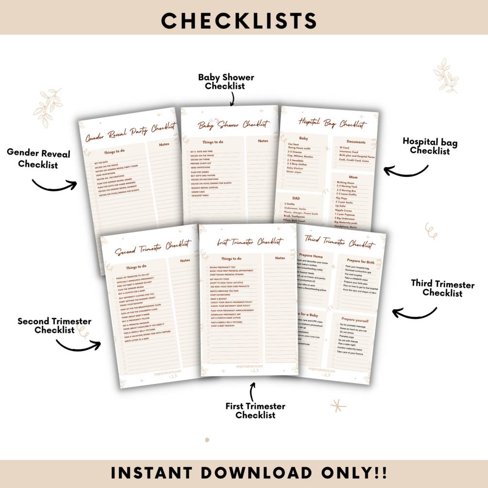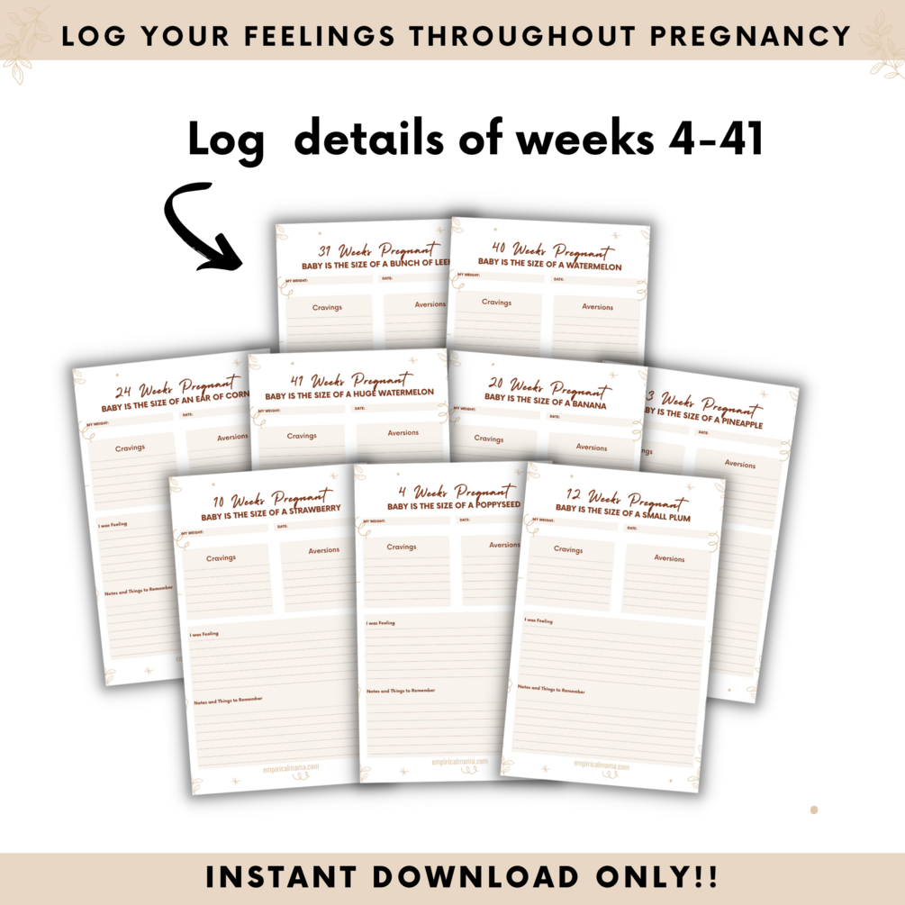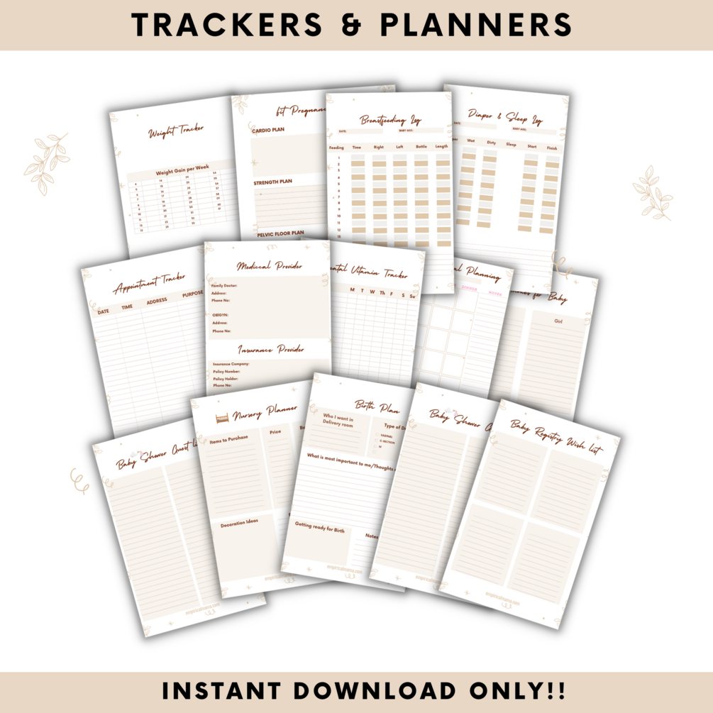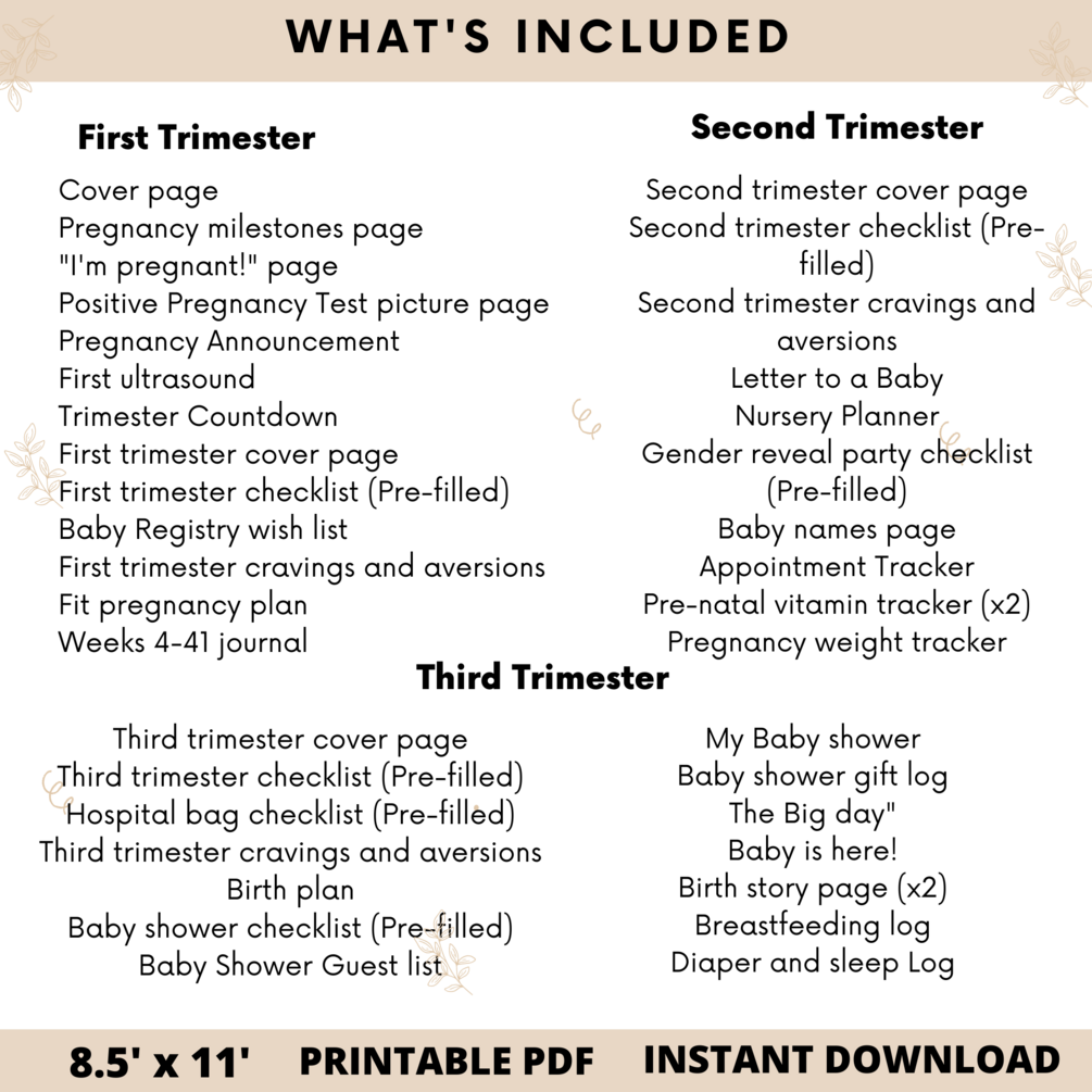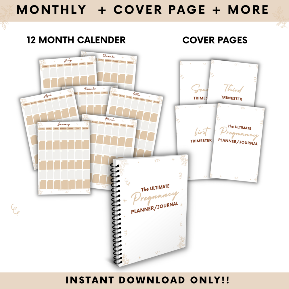 The 90 pages All-In-One Pregnancy Planner/Journal is a carefully laid out planner to note every stage of pregnancy. This planner features checklists, blank sheets to record precious memories and stay organized, a weekly journal to record your memories and symptoms plus much more.